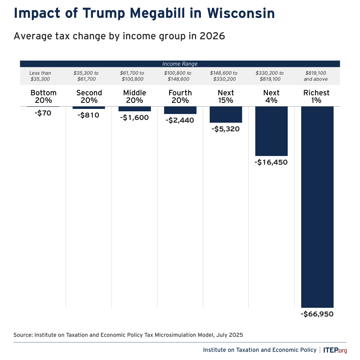 And finally, the federal budget reconciliation package, enacted this summer, contains hundreds of provisions with disturbing implications for working people. By permanently extending the first-term Trump tax cuts for the very wealthy, the new budget delivers $1 trillion over the next 10 years to the nation’s richest 1% and increases the national budget deficit to unprecedented levels. Analysis from the Institute on Taxation and Economic Policy shows that the annual tax break to Wisconsin’s richest 1% will be $67,000. And the tax break for the bottom fifth of households in the state? Just $70.
